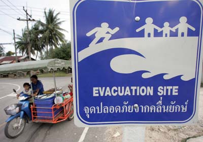 在泰國攀牙府,當地居民騎摩托車經過海嘯警示牌。印度洋海嘯發(fā)生近兩年來,受災各國采取各種預警方式,降低災難風險。