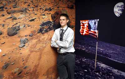 18日,在美國加利福尼亞州,美國宇航局艾姆斯研究中心戰(zhàn)略商業(yè)發(fā)展部主任克里斯·肯普在1996年拍攝的火星表面照片(左)和1968年拍攝的月球和地球照片(右)前留影。網(wǎng)絡(luò)搜索引擎谷歌(Google)將和美國宇航局合作,在網(wǎng)絡(luò)上提供美國宇航局發(fā)布的圖片,三維地圖和航天飛機(jī)的實(shí)時(shí)信息。