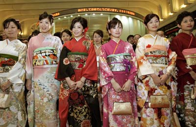 1月4日,在日本東京證券交易所,女職員身穿和服,慶祝2007年新年假期后第一個(gè)交易日的開(kāi)始。2006年,東京股市日經(jīng)指數(shù)累計(jì)上漲了6.92%,已連續(xù)4年保持上漲。
