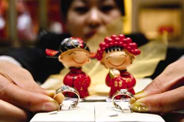 隨著新年的到來(lái),結(jié)婚新人陡然增多,見(jiàn)證愛(ài)情的信物“鉆戒”熱銷起來(lái)。記者4日在北京新東安商城的億龍鉆石了解到,近期,它們的鉆戒一天能賣出十多個(gè)。圖為一位工作人員在展示一對(duì)“情侶鉆戒”。