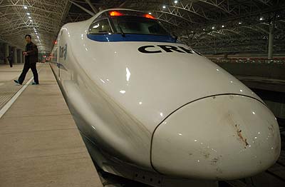 1月15日,新型“子彈頭”高速列車停在上海鐵路南站。當(dāng)日,新型CRH“子彈頭”高速列車在上海試車,將在2007年春運(yùn)期間投入使用。