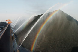 1月25日,秦皇島港使用經環(huán)保設備處理的中水對煤堆進行“洗澡”防塵。