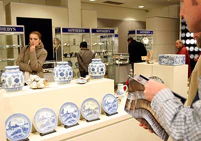 28日,在荷蘭首都阿姆斯特丹舉行的索斯比拍賣行的預展上,人們欣賞即將被拍賣的中國古瓷器。約7.6萬件在越南海域打撈上來的中國清代青花瓷器計劃于本月29日至31日在索斯比拍賣行拍賣。