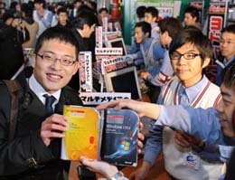 視窗Vista操作系統(tǒng)1月30日零時在日本全國同步發(fā)售,但購買了這種產(chǎn)品的用戶報告說,他們安裝Vista操作系統(tǒng)后,不能使用部分網(wǎng)絡(luò)銀行服務(wù),也不能正常使用電子郵件。圖為1月30日,在日本東京,買到視窗Vista的日本消費(fèi)者展示手中的產(chǎn)品。