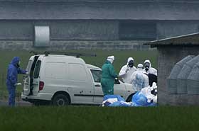 2月5日,在英國東部地區(qū)霍爾頓出現(xiàn)禽流感疫情的一農(nóng)場,工作人員身著防護(hù)服裝從一輛小貨車上卸下裝火雞的袋子。英國環(huán)境、食品和鄉(xiāng)村事務(wù)部當(dāng)日晚宣布,英國出現(xiàn)禽流感疫情農(nóng)場的15.9萬只火雞已被全部撲殺。新華社/路透