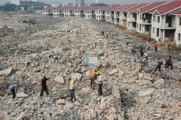 工人們正在一片廢墟回收廢棄的鋼筋。這片位于國家旅游度假區(qū)北海銀灘入口處的爛尾別墅群建于上個世紀九十年代初,成為那一輪“房地產(chǎn)熱”的遺留泡沫。由于開發(fā)商違規(guī)抵押,造成產(chǎn)權(quán)不清、債務(wù)錯綜復(fù)雜,北海市最近將這最難啃的“爛尾樓”骨頭成功拍賣,全部87幢別墅正在進行拆除,原址將按功能區(qū)規(guī)劃建設(shè)旅游項目。