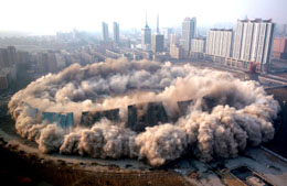 始建于1988年的五里河體育場是一個能容納近六萬人的體育場。2001年10月7日,中國足球隊在這里戰(zhàn)勝阿曼隊后,提前獲得2002年世界杯決賽階段入場券,這是中國足球第一次進軍世界杯決賽階段。2006年初,沈陽市政府決定,異地修建一座全新的足球場承辦奧運會比賽,將五里河體育場爆破拆除。圖為2月12日,沈陽五里河體育場在下午3時整被成功爆破拆除。