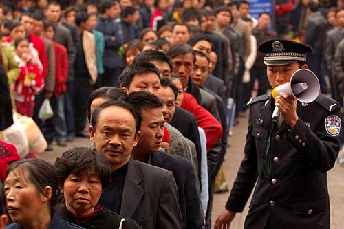 2月24日,一名鐵路公安民警在重慶火車站購票隊(duì)伍旁維持秩序。當(dāng)日是農(nóng)歷正月初七,重慶火車站迎來節(jié)后首個(gè)農(nóng)民工出行高峰。據(jù)重慶火車站負(fù)責(zé)人介紹,當(dāng)日重慶站預(yù)計(jì)發(fā)送旅客3.6萬人,旅客以農(nóng)民工為主。