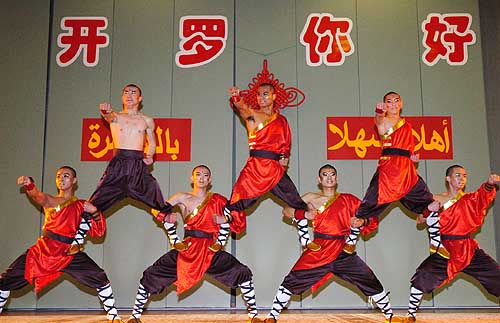 23日晚,中國(guó)藝人在埃及首都開羅國(guó)際會(huì)議中心表演中國(guó)功夫。當(dāng)日,來自北京八大廟會(huì)之一廠甸廟會(huì)的藝人們?cè)谶@里為當(dāng)?shù)厝罕姭I(xiàn)上了一場(chǎng)北京春節(jié)廟會(huì)特有的傳統(tǒng)民間藝術(shù)表演。這是中國(guó)春節(jié)廟會(huì)演出首次在埃及登臺(tái)亮相。