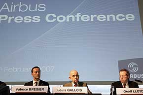 2月28日,歐洲空中客車公司總裁加盧瓦(中)、副總經(jīng)理布雷吉耶(左)和人力資源副總經(jīng)理勞埃德在法國圖盧茲出席關(guān)于公布空客大規(guī)模調(diào)整計劃的新聞發(fā)布會。新華社/路透