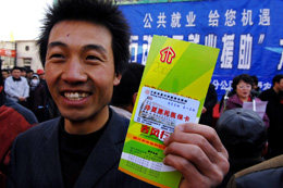 3月6日,寧夏“2007年度春風(fēng)行動(dòng)和再就業(yè)援助”活動(dòng)拉開帷幕,相關(guān)部門在啟動(dòng)儀式上為進(jìn)城務(wù)工人員代表發(fā)放了“醫(yī)?ā,農(nóng)民工憑借此卡可享受醫(yī)保服務(wù)。圖為來自安徽的農(nóng)民工吳國旭在展示他領(lǐng)到的“惠民醫(yī)?ā。