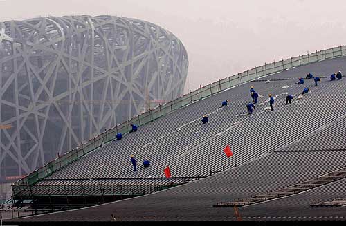 3月20日,工人們?cè)趪殷w育館屋頂施工。國家體育館位于北京奧林匹克公園中心區(qū)南部,是2008年奧運(yùn)會(huì)的主要比賽場(chǎng)館之一,與國家體育場(chǎng)、國家游泳中心共同構(gòu)成體育建筑組群。國家體育館建成后將承擔(dān)2008年奧運(yùn)會(huì)體操、蹦床、手球和殘奧會(huì)輪椅籃球比賽項(xiàng)目。