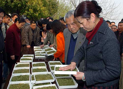 3月22日,茶葉專家正在現(xiàn)場查看剛剛炒制出來的西湖龍井茶的色澤。當(dāng)天,2007年西湖龍井炒茶技藝大賽在杭州舉行,30多位來自西湖龍井茶區(qū)的炒茶高手爭奪2007年“炒茶王”桂冠,比賽結(jié)束后,經(jīng)過專家組對茶葉色澤、香氣、湯味等指標(biāo)的嚴(yán)格評選,最后精選的200克極品西湖龍井“茶王茶”當(dāng)場被買家以11萬元的天價拍走。
