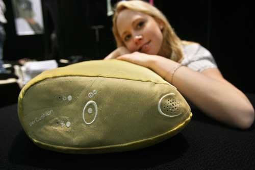 一名工作人員在德國(guó)漢諾威舉辦的國(guó)際信息及通信技術(shù)博覽會(huì)(CeBIT)上展示能打電話的枕頭。由于內(nèi)部設(shè)置了配有藍(lán)牙耳機(jī)和揚(yáng)聲器的手機(jī),所以躺在這個(gè)枕頭上接打電話非常方便。