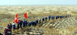 圖為排著長(zhǎng)隊(duì)的寧夏銀川市學(xué)生走進(jìn)毛烏素沙地參加義務(wù)治沙造林活動(dòng)。