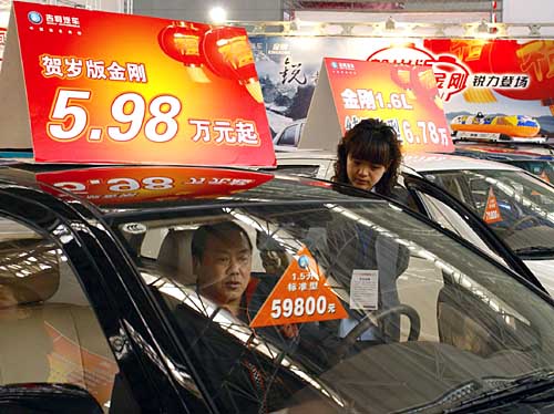 3月24日,一位市民在了解一款售價為5.98萬元的經(jīng)濟型轎車。在24日開幕的2007哈爾濱“百姓購車周”上,價位在10萬元以下的經(jīng)濟型轎車受到冰城市民的關注。