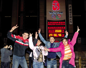 昨天(26日),幾名學(xué)生在中國國家博物館門前的2008年奧運會倒計時牌前歡呼留影。當(dāng)晚,北京迎來2008年奧運會倒計時500天。