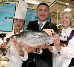 3月27日,挪威首相斯托爾滕貝格(中)在北京一超市內(nèi)展示來自挪威的三文魚。當(dāng)日,挪威三文魚中國(guó)推廣活動(dòng)在北京拉開帷幕,正在北京訪問的挪威首相斯托爾滕貝格及其一行親臨現(xiàn)場(chǎng),品嘗三文魚食品,“推銷”挪威產(chǎn)三文魚。