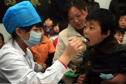 3月23日,北京市豐臺區(qū)醫(yī)務(wù)人員在振華民生學(xué)校為流動兒童進行脊髓灰質(zhì)炎(小兒麻痹)的接種。當(dāng)日,北京市豐臺區(qū)衛(wèi)生局啟動了“一個都不能少——-為流動兒童送健康”主題活動,免費為該地區(qū)的流動兒童進行流腦、麻疹和脊髓灰質(zhì)炎(小兒麻痹)等傳染病的預(yù)防接種。預(yù)計到今年4月20日,豐臺區(qū)將完成對全區(qū)3萬名流動兒童免費接種防病疫苗。 |