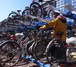 4月2日,工作人員在北京崇文門附近的一個自行車存放處安裝雙層自行車停放裝置。這種雙層自行車裝置不僅可以在有限的空間內(nèi)停放更多的自行車,還可以更好地保證自行車的安全,使用者可以通過拉桿輕松地存取車輛。