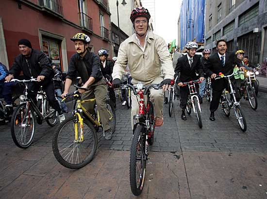 2日,為推廣使用自行車,墨西哥首都墨西哥城市長(zhǎng)馬塞洛·埃夫拉德(中)帶頭騎自行車上班。墨西哥城近日興起一場(chǎng)推廣使用自行車運(yùn)動(dòng)。