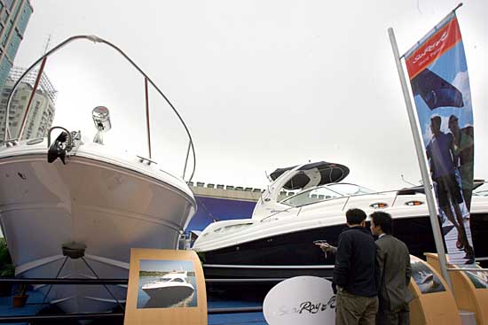 4月5日,參觀者在參展游艇前駐足。當(dāng)日,2007中國(上海)國際游艇展在上海展覽中心開幕,來自世界各地的70多艘各式游艇實(shí)船參展,除了有頂級(jí)的豪華游艇外,各式中、低價(jià)游艇紛紛亮相,成為亮點(diǎn)。