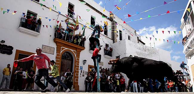 8日,在西班牙南部小鎮(zhèn)貝赫爾-德拉弗龍?zhí)乩,一名男子在一頭公牛前奔跑。當天是這個小鎮(zhèn)傳統(tǒng)的節(jié)日奔牛節(jié),盡管它與著名的西班牙潘普洛納奔牛節(jié)規(guī)模不能相比,但是小鎮(zhèn)居民和游客仍對此節(jié)日充滿激情。