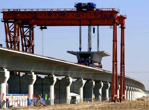 4月10日,京津城際軌道交通天津段正在進行架梁作業(yè)。目前京津城際軌道交通線路正在緊張施工中,這條從北京南站東端引出、直至天津站的快速鐵路,全長115公里,將于2008年7月投入運營,區(qū)間列車運行時長為30分鐘。