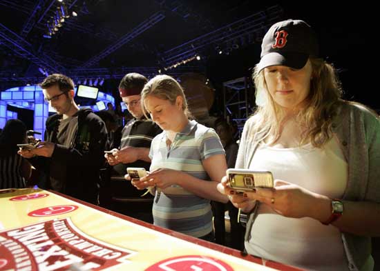 21日,在美國紐約,幾名參加手機短信比賽的選手在發(fā)短信。當日,在一家手機公司舉辦的手機短信比賽上,一名來自賓夕法尼亞州的13歲的小女孩獲得“東海岸冠軍”。屆時,她將與來自洛杉磯的“西海岸冠軍”爭奪最后的勝利。