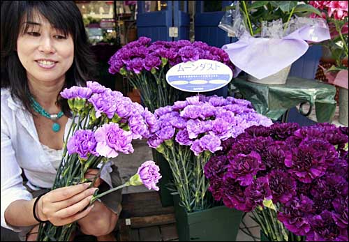 9日,日本東京街頭一家花店的店員展示名為“月球塵埃”的罕見藍色康乃馨。這種康乃馨由日本和澳大利亞的公司聯(lián)合開發(fā),隨著母親節(jié)的臨近開始投放市場。