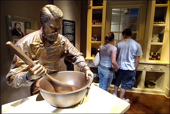5月24日,在美國佐治亞州亞特蘭大市,一些游客在新可口可樂中心參觀。近景為可口可樂創(chuàng)始人彭伯頓先生1886年配制可口可樂的雕塑。當天,新可口可樂中心正式啟用。始建于1990年的可口可樂中心是美國南部著名的旅游項目和世界上著名的企業(yè)博物館,每年接待75萬游客。剛剛啟用的新可口可樂中心占地8500多平方米,預計第一年將接待超過100萬游客。