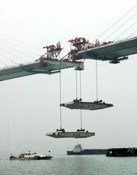 蘇通大橋的主跨合龍預(yù)計(jì)于6月中旬吊裝完畢。屆時(shí),被稱為世界第一斜拉索大橋的全長32.4公里、連接蘇州與南通兩座江蘇古城的蘇通大橋?qū)⑷尕炌ā?!--/enpcontent-->