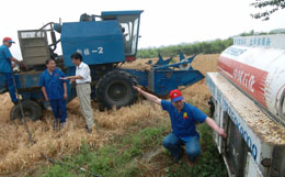 從5月下旬麥?zhǔn)臻_(kāi)始,中國(guó)石化山西運(yùn)城石油公司組織16支“三夏”送油服務(wù)隊(duì),送油到小麥?zhǔn)崭顓^(qū),確!叭摹逼陂g農(nóng)用柴油供應(yīng)。圖為在山西省夏縣水頭鎮(zhèn)牛家凹村,中國(guó)石化的工作人員正為一臺(tái)小麥?zhǔn)崭顧C(jī)加油。