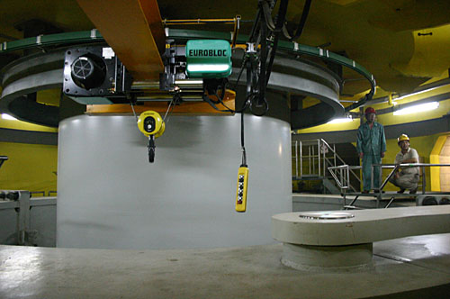 6月11日,工程技術(shù)人員在對(duì)率先投入運(yùn)營的22號(hào)機(jī)組進(jìn)行監(jiān)測(cè)。當(dāng)日,三峽工程右岸電站首臺(tái)機(jī)組——22號(hào)機(jī)組經(jīng)過一個(gè)多月的調(diào)試運(yùn)行,正式并網(wǎng)發(fā)電,投入運(yùn)營。這標(biāo)志著三峽三期工程開始發(fā)揮效益。 | |