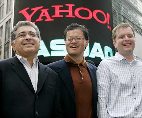 美國著名網(wǎng)絡搜索公司“雅虎”6月18日宣布重大高層變動,原任董事長兼首席執(zhí)行官的特里·塞梅爾辭去首席執(zhí)行官職務,公司創(chuàng)始人之一、美籍華人楊致遠出任首席執(zhí)行官,從而重掌雅虎門戶。這張2005年3月2日拍攝的資料照片顯示,楊致遠(中)與塞梅爾(左)以及“雅虎”公司另一創(chuàng)始人菲洛在美國時報廣場合影。