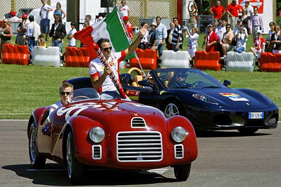 23日,在意大利的菲奧拉諾,法拉利車隊車手萊克寧(左)和馬薩駕駛法拉利公司1947年的賽車F125參加慶;顒印.斕,法拉利公司在大本營菲奧拉諾舉行慶;顒,紀念這個意大利最有名氣的汽車品牌誕生60周年。