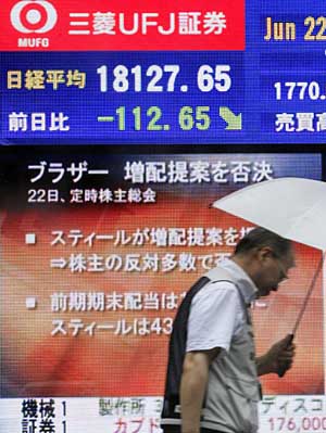 6月22日下午2點(diǎn)左右(北京時間下午1點(diǎn)左右),一名行人從日本東京一塊股票交易顯示牌前走過,上面顯示日經(jīng)指數(shù)較前日有大幅下跌。