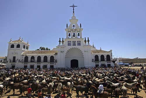 | 26日,在西班牙南部瓜達(dá)爾基維爾河口地區(qū)的埃爾羅西奧,人們在“驅(qū)趕母馬”活動上將眾多母馬匯集到一起。瓜達(dá)爾基維爾河口地帶是西班牙南部著名的養(yǎng)馬地。每年6月26日,牧人們都要舉行“驅(qū)趕母馬”活動,將放養(yǎng)在河口地區(qū)多尼亞納國家公園里的母馬先集中到埃爾羅西奧,再集體趕往附近的阿爾蒙特參加傳統(tǒng)的牲畜集市。上百匹馬集體行動,場面蔚為壯觀。目前,這已經(jīng)成為當(dāng)?shù)刂匾哪翗I(yè)傳統(tǒng)文化活動。 | |