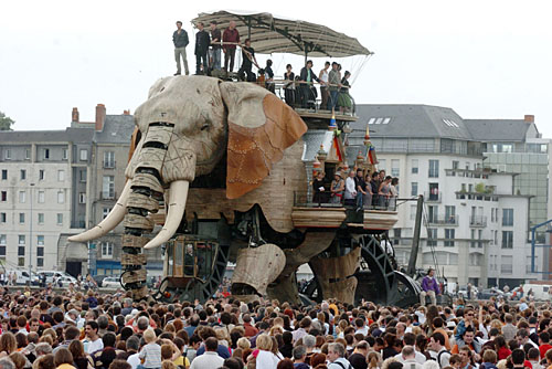6月30日,在法國(guó)西部城市南特,大批民眾圍觀一頭12米高的巨型機(jī)器大象。這頭威風(fēng)凜凜的機(jī)器大象來(lái)到這里是為當(dāng)?shù)嘏e行的一個(gè)旅游文化推介活動(dòng)助威。