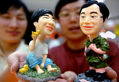 近日,寧夏銀川一家禮品店推出卡通人像雕塑項目,只需一張照片就能為顧客“克隆”出惟妙惟肖的卡通造型,受到眾多年輕人的歡迎。圖為顧客在展示各自的軟陶卡通雕塑。