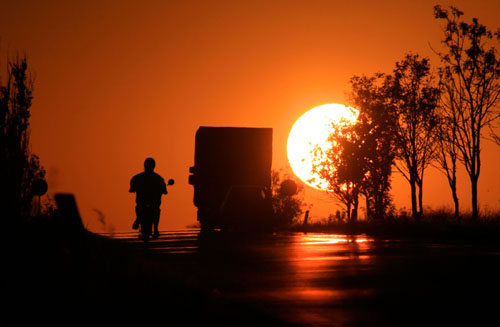 15日,夕陽照在捷克中部小鎮(zhèn)沙多瓦的公路上。當(dāng)天,捷克遭遇酷熱天氣,部分地區(qū)氣溫超過40攝氏度。