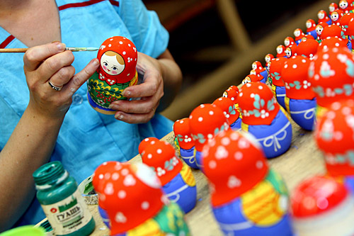 20日,在俄羅斯首都莫斯科郊外謝爾吉耶夫鎮(zhèn)的奧菲斯套娃工廠,一名工人在套娃木胎上繪制圖案。始建于1947年的奧菲斯套娃工廠目前是莫斯科周邊地區(qū)為數(shù)不多的生產(chǎn)這種俄羅斯傳統(tǒng)手工藝品的工廠之一,50余人的工廠每兩天可制成100套套娃,產(chǎn)品遠(yuǎn)銷日本、加拿大等國。這些樣式各異的套娃中,最大的有1米多高,最小的高度不足1厘米。這些椴木制的手工藝品有著絢麗的色彩、可愛的造型、極具俄羅斯民族特色的圖案以及精美的做工。
