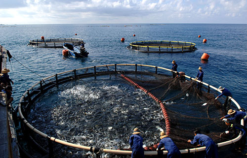 7月27日,中國石油天然氣集團(tuán)總公司三亞深海網(wǎng)箱養(yǎng)殖基地的職工在網(wǎng)箱撈魚,該基地的魚貨一半以上用于出口。2007年上半年,海南省水產(chǎn)品出口達(dá)39800多噸,比去年同期增長36%,產(chǎn)品出口美國、日本、加拿大等30多個國家和地區(qū)。