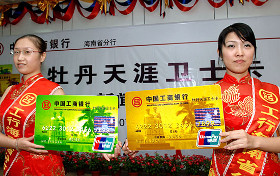 | 7月30日,工商銀行海南省分行的工作人員展示首張專門為部隊官兵服務(wù)的銀行卡--“牡丹天涯衛(wèi)士信用卡”!鞍艘弧鼻跋,一款專門為部隊官兵提供金融服務(wù)的銀聯(lián)標準信用卡--“牡丹天涯衛(wèi)士信用卡”在海南面世,這是我國第一張專門為部隊官兵提供服務(wù)的銀行卡。它是工商銀行海南省分行專門為駐守海南的各部隊官兵及武警官兵提供的一項獨到的、個性化服務(wù)產(chǎn)品。除具有信用消費、存取現(xiàn)金、電子銀行等先進的服務(wù)功能外,部隊官兵還能在執(zhí)行任務(wù)時隨時變動透支額度,滿足應(yīng)急要求。 | |