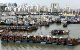 8月5日,漁船在?谑行赂鄞a頭避風(fēng)。目前,2007年第6號(hào)熱帶風(fēng)暴正逐漸向海南島逼近,漁船紛紛回港避風(fēng)。