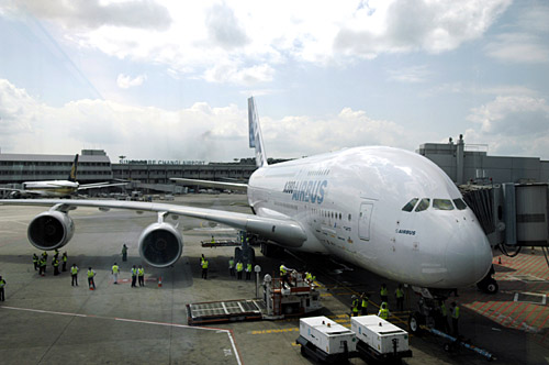 13日,一架空客A380客機在新加坡樟宜機場接受測試。當天,9日抵達這里的一架空客A380客機開始接受為期6天的各種測試。A380客機為雙層結(jié)構(gòu),有4個發(fā)動機,標準配置的座位數(shù)是519個,如果用戶需要,可以最多調(diào)整成800人以上的配置,是目前全球載客量最大的客機。