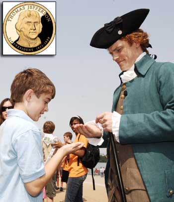 15日,在美國華盛頓的杰斐遜紀(jì)念堂前舉行的一美元杰斐遜“總統(tǒng)硬幣”發(fā)行儀式上,一名裝扮成杰斐遜的演員(右)向參加儀式的孩子們贈(zèng)送杰斐遜“總統(tǒng)硬幣”。美國總統(tǒng)布什去年簽署法案,規(guī)定美國鑄幣局從今年開始鑄造鐫有去世兩年以上的美國總統(tǒng)頭像的一美元硬幣,按總統(tǒng)任職先后順序,每三個(gè)月發(fā)行一次,每年發(fā)行四種。左上角小圖為一美元杰斐遜“總統(tǒng)硬幣”的正面圖案。