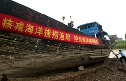8月28日,工人在拆解報(bào)廢漁船。 當(dāng)日,農(nóng)業(yè)部漁業(yè)局及東海區(qū)漁政漁港監(jiān)督管理局在上海舉行回收的海洋捕撈漁船主機(jī)功率憑證集中銷(xiāo)毀儀式,同時(shí),對(duì)部分轉(zhuǎn)產(chǎn)報(bào)廢漁船進(jìn)行了現(xiàn)場(chǎng)拆解。據(jù)悉,由于我國(guó)目前海洋漁業(yè)資源持續(xù)衰退,現(xiàn)有捕撈力量嚴(yán)重過(guò)剩,到2010年,我國(guó)將消減三萬(wàn)艘捕撈漁船,轉(zhuǎn)移約20萬(wàn)勞動(dòng)力,以確保我國(guó)海洋漁業(yè)的可持續(xù)發(fā)展。 |