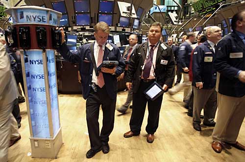 28日,交易員在美國紐約證券交易所工作。受一系列利空消息影響,紐約股市當日全面下挫,其中道瓊斯指數(shù)重挫280.28點。