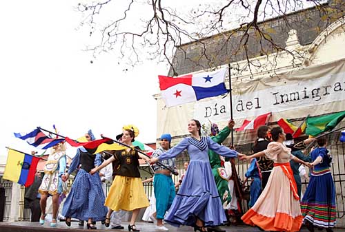 4日,在阿根廷首都布宜諾斯艾利斯移民局前舉行的慶祝移民節(jié)活動上,演員們表演富有拉美和歐洲風(fēng)情的舞蹈。當(dāng)天,包括中國在內(nèi)的30多個國家的移民社團(tuán)參加了布宜諾斯艾利斯的移民節(jié)慶;顒。